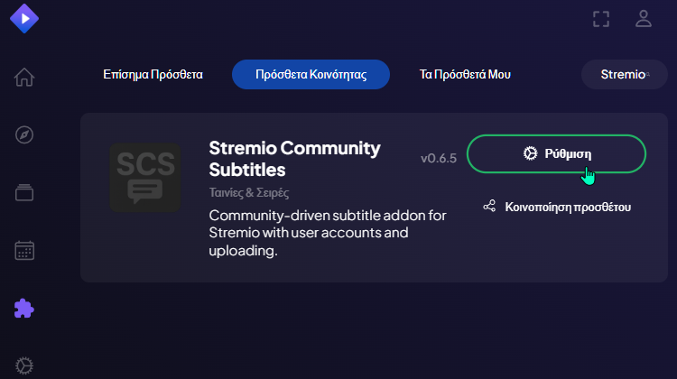 Έτσι, πηγαίνουμε στο Stremio app του PC, πατάμε στο εικονίδιο των plugins στα αριστερά, από τα Πρόσθετα κοινότητας επιλέγουμε το Stremio Community Subtitles, και πατάμε διαδοχικά στην Εγκατάσταση, (αν δεν είναι ήδη εγκατεστημένο).