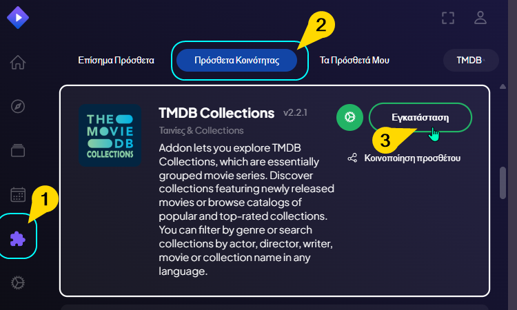 Τώρα, πηγαίνουμε σε όποιο Stremio app θέλουμε (λογικά βολεύει από το PC), πατάμε στο εικονίδιο των plugins στα αριστερά, από τα Πρόσθετα κοινότητας επιλέγουμε το TMDB Collections, και πατάμε διαδοχικά στην Εγκατάσταση.