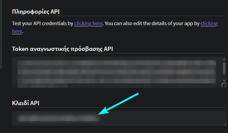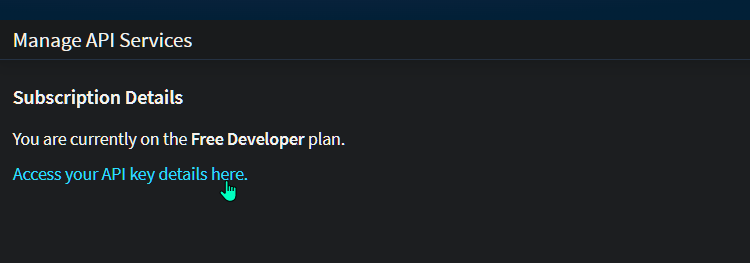 Μόλις ολοκληρωθεί η εγγραφή μας, εντοπίζουμε το κλειδί πατώντας πάνω δεξιά στο εικονίδιο του λογαριασμού μας, και μετά διαδοχικά AΡΙ Subscription ➜ Access your APl key details here ➜ Κλειδί API, και το αντιγράφουμε ή το αποθηκεύουμε κάπου να το έχουμε εύκαιρο.