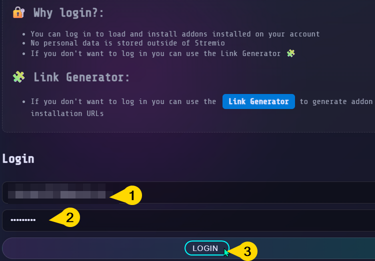 Κατόπιν, στο κάτω τμήμα της σελίδας, πρέπει να εισάγουμε τα συνθηματικά του λογαριασμού μας στο Stremio, και να πατήσουμε στο Login.