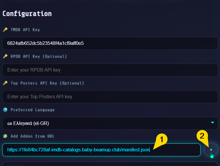 Θα μας ανοίξει η σελίδα του Configuration, όπου αρχικά πρέπει να επικολλήσουμε το Κλειδί API του TMDB που αντιγράψαμε προηγουμένως. Μετά, λίγο πιο κάτω πατάμε στο βελάκι στα δεξιά και ορίζουμε τα ελληνικά.