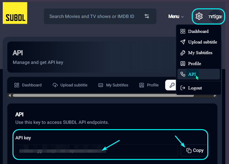 Επιπλέον, με τον ίδιο τρόπο μπορούμε να συνδέσουμε και το SubDL εφόσον έχουμε ανοίξει και εκεί λογαριασμό και API Key. Το εντοπίζουμε στην επίσημη σελίδα του SubDL, από τον λογαριασμό μας πάνω δεξιά, και το αντιγράφουμε