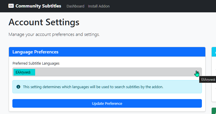 Αφού επιβεβαιώσουμε την εγγραφή στο email που θα μας έρθει και εισέλθουμε με τον λογαριασμό μας στη σελίδα του Community Subtitles, πατάμε εδώ (Account Settings) για να μας εμφανιστεί η καρτέλα με τους εξωτερικούς παρόχους υποτίτλων. Μόλις βεβαιωθούμε ξανά ότι έχουν επιλεχθεί τα ελληνικά…