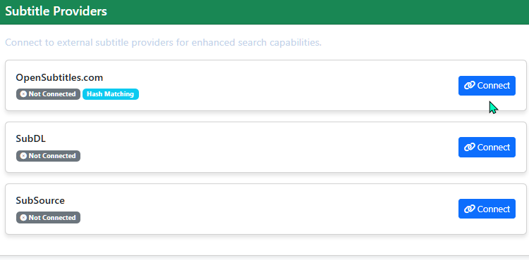 …μπορούμε παρακάτω στην ίδια σελίδα να συνδέσουμε απευθείας (πατώντας στο Connect) και το OpenSubtitles.com που θα δούμε. Φυσικά, εφόσον πρώτα έχουμε ανοίξει λογαριασμό στην επίσημη σελίδα τους