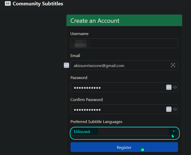 …θα μας ανοίξει η σχετική σελίδα στον browser (Go to stremio-community-subtitles.top), όπου πρέπει να κάνουμε μια εγγραφή (Register here), ορίζοντας και τα ελληνικά.
