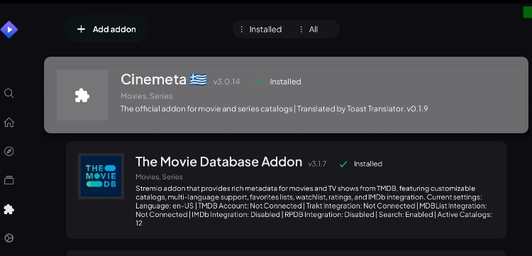 Ούτε καν βαθμολογίες στα posters των έργων και ελληνικούς τίτλους όπως ακριβώς γίνεται με το Kodi, καθώς το Cinemeta που επιβάλλουν οι σχεδιαστές του Stremio στα metadata περιορίζεται αποκλειστικά στα αγγλικά, και απαιτούνται πληρωμένα κλειδιά RPDB για τα ratings στις μικρογραφίες των έργων.