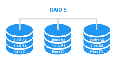 Το RAID 5 υλοποιείται με τουλάχιστον τρεις δίσκους, ενώ μπορεί να χάσει τον ένα από αυτούς χωρίς να επηρεαστούν τα συνολικά δεδομένα.