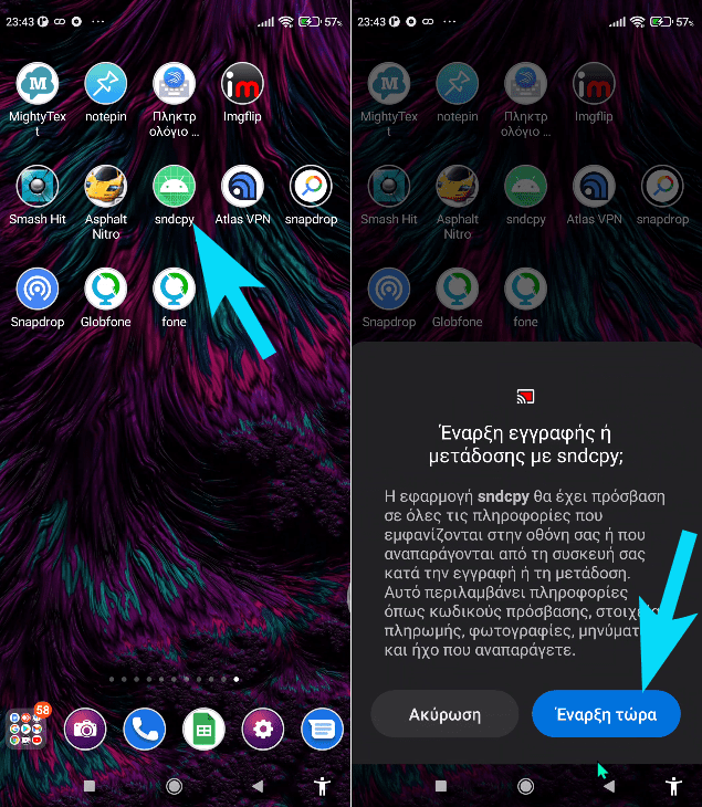 Αν θέλουμε να ενεργοποιήσουμε τον ήχο στα παιχνίδια κινητού, – και όχι μόνο – πατάμε στην εφαρμογή του sndcpy που έχει εγκατασταθεί με τις εντολές που δώσαμε μια και έξω στα αρχικά βήματα, και μετά στο Έναρξη τώρα”.