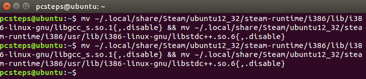 mv ~/.local/share/Steam/ubuntu12_32/steam-runtime/i386/lib/i386-linux-gnu/libgcc_s.so.1{,.disable} && mv ~/.local/share/Steam/ubuntu12_32/steam-runtime/i386/usr/lib/i386-linux-gnu/libstdc++.so.6{,.disable}