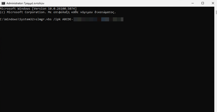 Για να το κάνουμε αυτό, στη νέα μας συσκευή ανοίγουμε τη Γραμμή εντολών με δικαιώματα διαχειριστή και εισάγουμε το κλειδί προϊόντος πληκτρολογώντας την παρακάτω εντολή, μαζί εντολή μαζί με το 25ψήφιο κλειδί προϊόντος και πατάμε Enter.