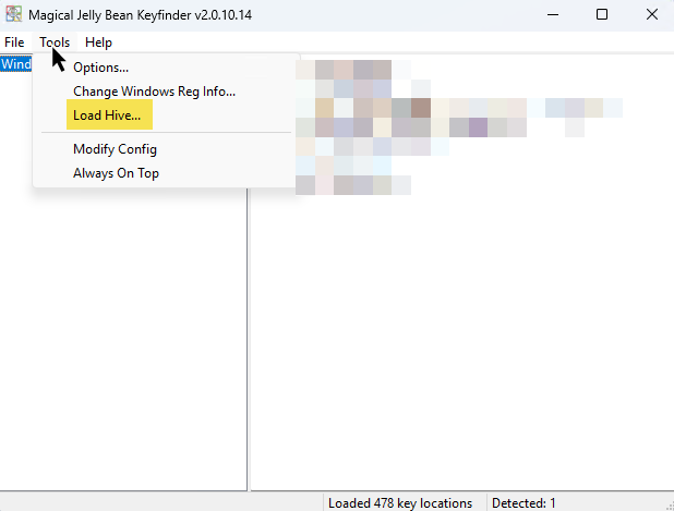 Για να βρούμε το Windows License σε δίσκο που έχουμε συνδέσει, πηγαίνουμε στα Εργαλεία (Tools) και επιλέγουμε Load Hive.