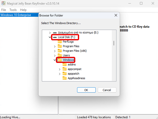 Επιλέγουμε τον συνδεδεμένο δίσκο, βρίσκουμε το φάκελο Windows και πατάμε ΟΚ.