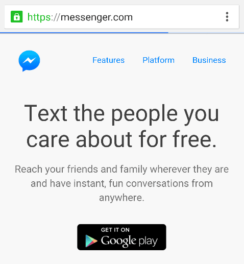Τέλος, η ιστοσελίδα messenger.com δεν λειτουργεί μέσω κινητού ή tablet. Μπαίνοντας σε αυτή θα δεχθούμε ένα μήνυμα να κατεβάσουμε την αντίστοιχη εφαρμογή Messenger από το Google Play ή το iTunes.