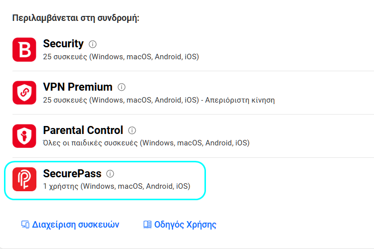 - Εξελιγμένο Password manager που διευκολύνει τον χειρισμό κωδικών πρόσβασης και την ασφαλή κοινή χρήση τους. Για το Bitdefender SecurePass, θα αναφερθούμε αναλυτικά σε επόμενο σχετικό οδηγό