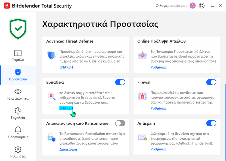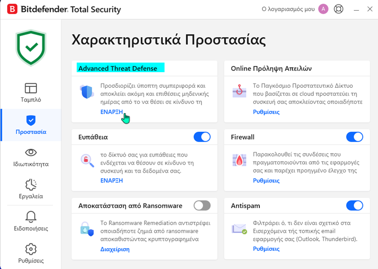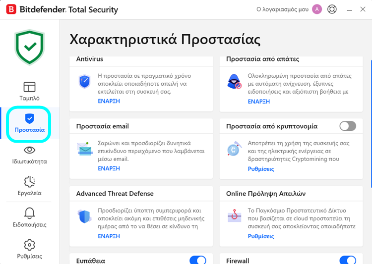 Εδώ θα βρούμε τις δυνατότητες για τον πλήρη έλεγχο του συστήματος, καθώς και τη διαχείριση των λειτουργιών για antispam, προστασία από ransomware, το τείχος προστασίας, και άλλα.