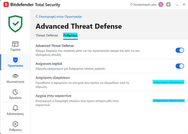 Επιπλέον, από τις Ρυθμίσεις μπορούμε να εξαιρέσουμε εφαρμογές που γνωρίζουμε με σιγουριά ότι είναι ασφαλείς, καθώς και να δούμε τα αρχεία που είναι στην καραντίνα.