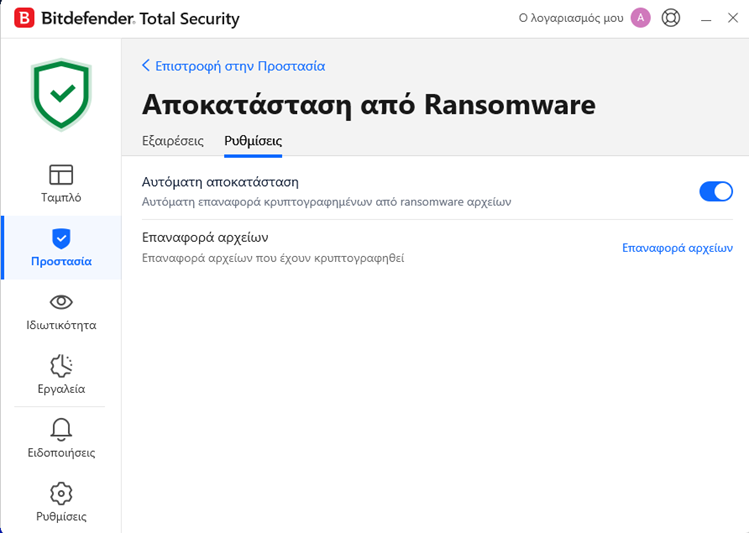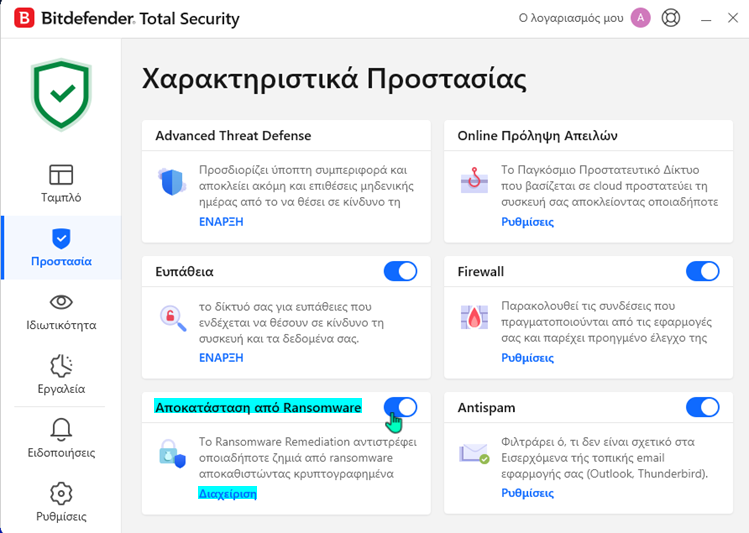 Το Bitdefender Premium Security περιλαμβάνει τη λειτουργία για την προστασία από ransomware. Με αυτή τη λειτουργία, εμποδίζει ύποπτες τροποποιήσεις στα προσωπικά μας αρχεία.