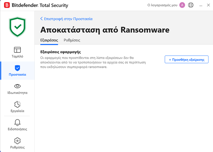 Αν κάποια εφαρμογή θεωρούμε ότι είναι ασφαλής, μπορούμε να την προσθέσουμε στη λίστα εξαιρέσεων.