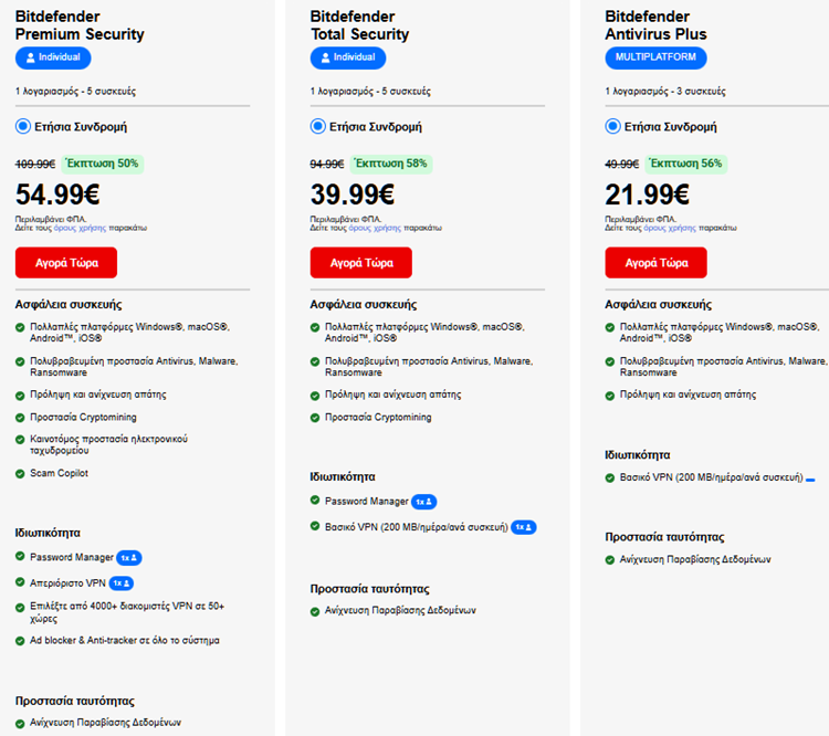 H Bitdefender διαθέτει μια ευρεία γκάμα προϊόντων, από το απλό και οικονομικό Antivirus Plus Multiplatform, μέχρι τις υπερπλήρεις και πολυβραβευμένες σουίτες Total Security και Premium Security για όλες τις πλατφόρμες.
