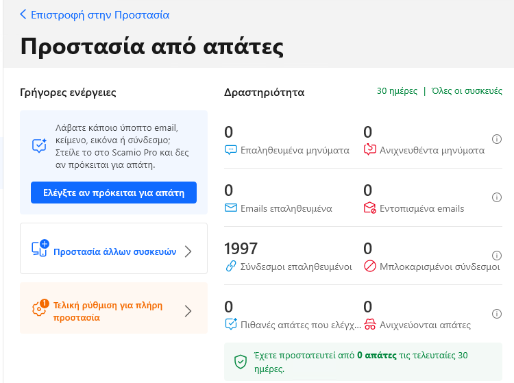 Ο πίνακας ελέγχου στην προστασία από απάτες παρέχει πρόσβαση στις κύριες λειτουργίες και χωρίζεται σε 2 ενότητες: Γρήγορες ενέργειες και Δραστηριότητα.