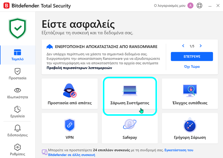 Σε γενικές γραμμές, η γρήγορη σάρωση μας αρκεί για να επιβεβαιώσουμε ότι είναι καθαρό το σύστημά μας. Αν θέλουμε, όμως, έναν ενδελεχή έλεγχο όλων των δίσκων, με τη Σάρωση Συστήματος το Bitdefender θα σαρώσει όλα μας τα αρχεία.