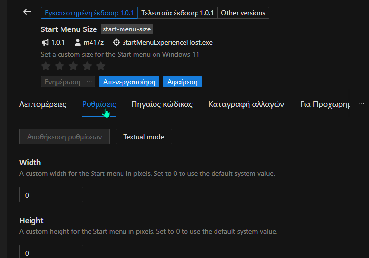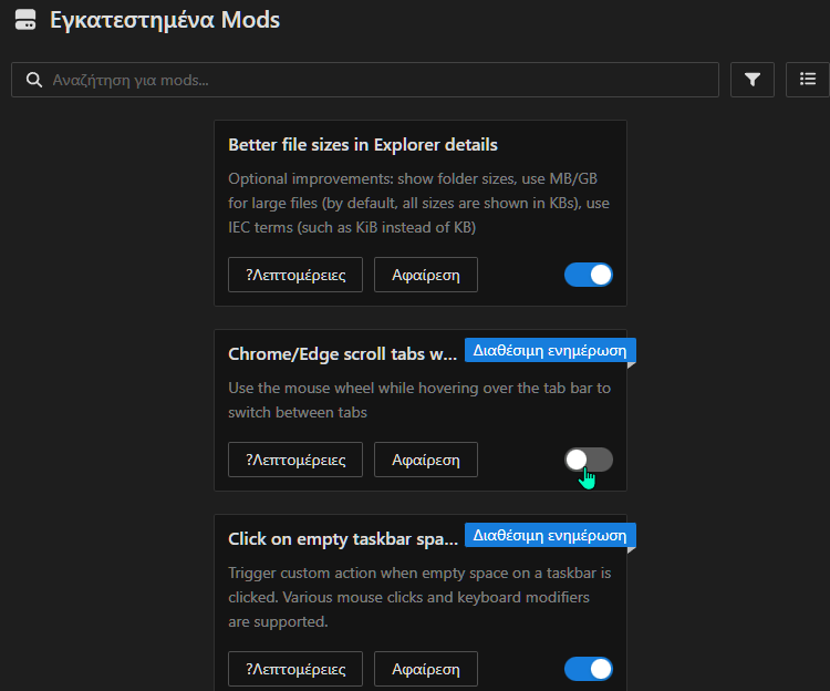 Τέλος, σε περίπτωση που κάτι δεν μας αρέσει, απλώς απενεργοποιούμε το mod μέχρι νεοτέρας. Δεν θα υπάρξουν επιπτώσεις στο σύστημά μας. Όπως και με όλα τα mods του Windhawk, μπορούμε και να το καταργήσουμε με ένα κλικ αν το επιθυμούμε (Αφαίρεση).