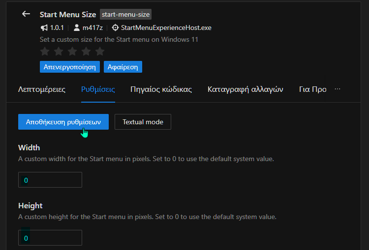 Επίσης, καλό είναι να θυμόμαστε ότι, αν σε κάποια φάση θελήσουμε να γυρίσουμε στην προεπιλεγμένη συμπεριφορά, απλά ορίζουμε πλάτος = 0 και ύψος = 0, και πατάμε πάλι στο Αποθήκευση ρυθμίσεων.