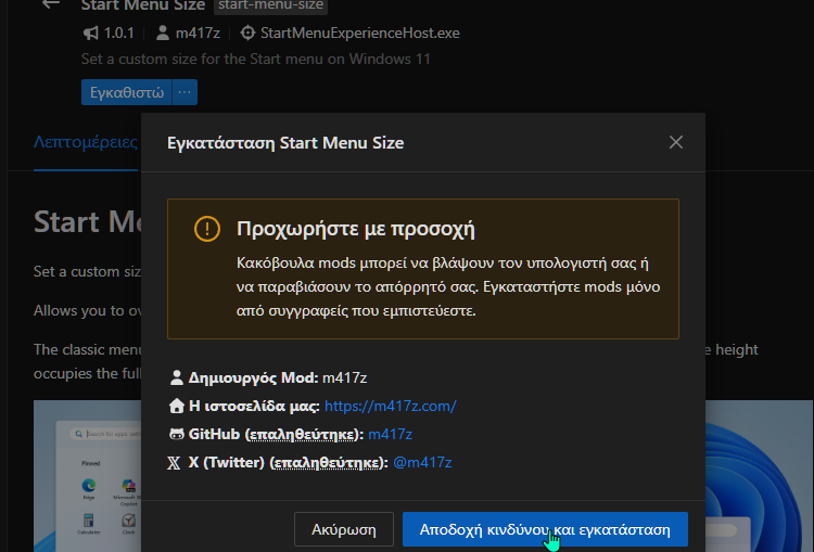 Όταν πατάμε αυτό το κουμπί, θα λαμβάνουμε πάντα μια ειδοποίηση να προχωρήσουμε με προσοχή. Ωστόσο, αν βλέπουμε το verified (επαληθεύτηκε) και υπάρχει σχετικός σύνδεσμος προς τη σελίδα του δημιουργού στο GitHub και στο X, αυτό σημαίνει ότι δεν συντρέχουν λόγοι ανησυχίας.